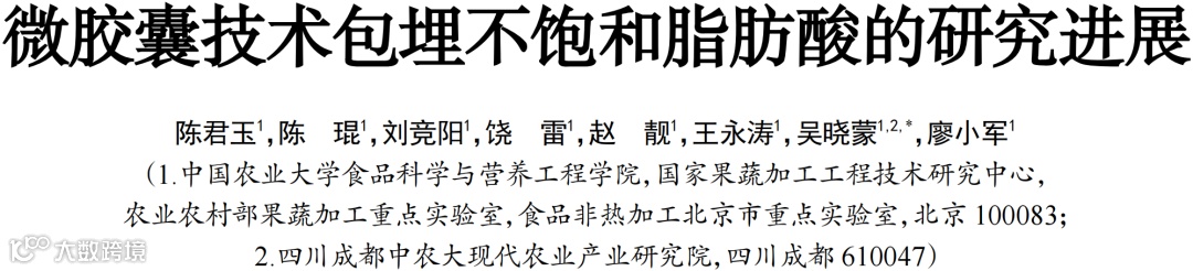 2023年7月,中国农业大学和四川成都中农大现代农业产业研究院吴晓蒙副教授课题组在国家综合性科技期刊《食品工业科技》发表题为《微胶囊技术包埋不饱和脂肪酸的研究进展》的论文。中国农业大学等吴晓蒙副教授为通讯作者,中国农业大学硕士研究生陈君玉为第一作者。论文得到了四川省级财政农业改革创新科技示范奖补专项资金资助项目(SCB-ZNCY-2022006)的资助。