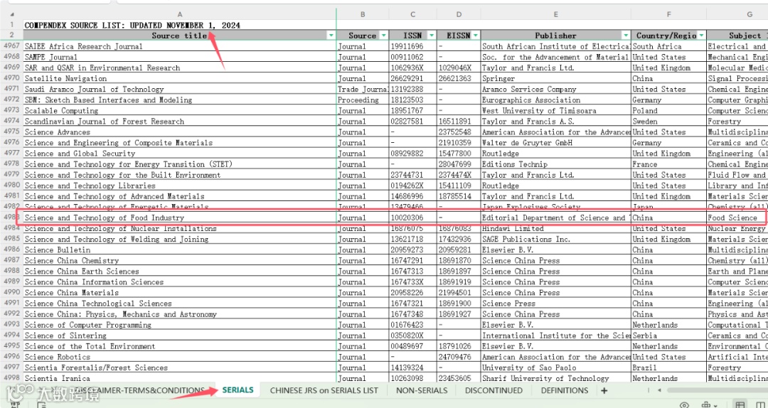 在表格的SERIALS列表中,搜索“Science and Technology of Food Industry”,或者10020306。中国知网会于年底统一更新各期刊数据库收录情况,我刊被EI收录的更新也将于本年底一并更新,请各位作者关注。
