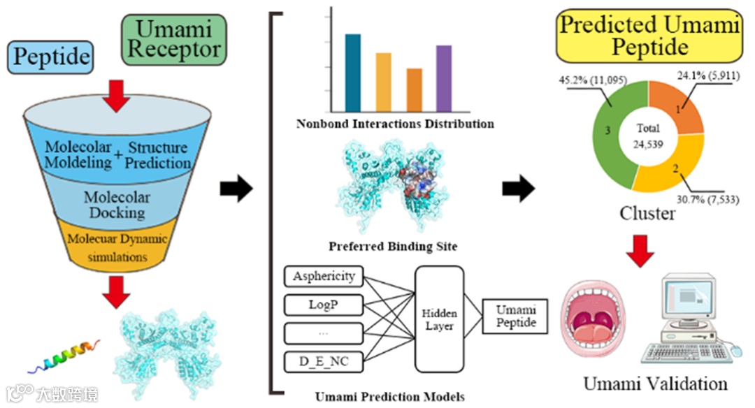 ●近日,山东农业大学食品科学与工程学院李大鹏教授团队在农林科学一区TOP期刊《Journal of Agricultural and Food Chemistry》在线发表了题为“Exploring the Relationship between Small Peptides and the T1R1/T1R3 Umami Taste Receptor for Umami Peptide Prediction: A Combined Approach”的研究论文。该论文研究了T1R1/T1R3鲜味受体与2-4肽(168,400条)的结合模式,基于计算化学和机器学习方法,利用多维分子描述符建立了一种鲜味小肽预测模型(https://github.com/Umami-TD/Umami_TD)。博士研究生张文渊为第一作者,邹辉副教授、李大鹏教授为通讯作者。