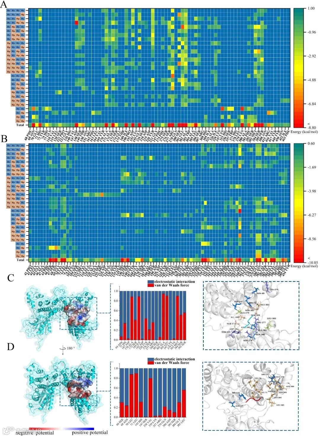 图3 T1R1/T1R3口袋位点与小肽的结合自由能热图及关键氨基酸的作用力分布。