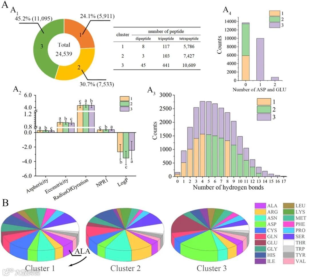 图4预测鲜味肽的聚类结果和参数分布。