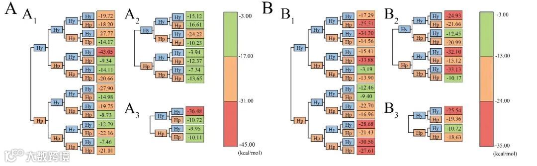 图2 亲水性(Hy)/疏水性(Hp)氨基酸组成的小肽与T1R1和T1R3口袋结合自由能。