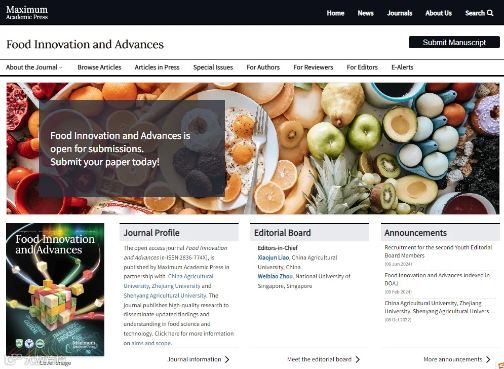 《Food Innovation and Advances》:CABI、Google Scholar、J-Gate等数据库收录期刊官网:www.maxapress.com/fia投稿链接:https://mc03.manuscriptcentral.com/fia