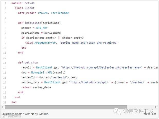 接下来我会在/lib/thetvdb目录下创建client.rb文件。这个文件会包装API的查询。最后,如下完成剩余的代码。