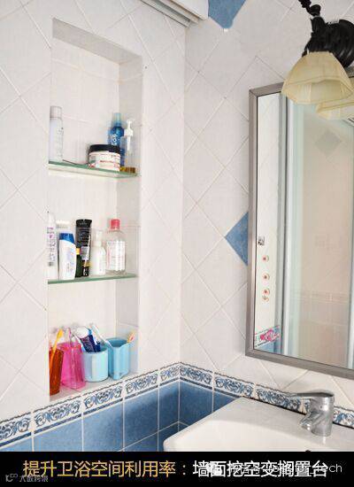 凹陷空间巧收纳:在改造卫浴间时,还有一个比较好的提升卫浴空间的小技巧,那就是在卫浴间墙面进行挖空处理,后期贴上瓷砖,就可以形成一个搁置台,用于放置卫浴用品。
