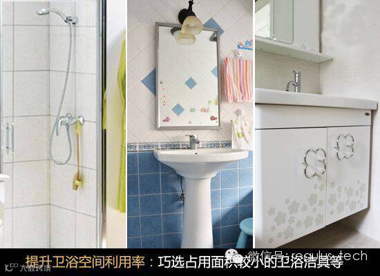 巧选卫浴洁具:淋浴相比于浴缸来说,占据空间面积要小很多,因此如果是小户型卫浴,最好不要选用浴缸;而挂墙式浴室柜或马桶、立柱式台盆等都可以省下不少卫浴空间;此外,对于空间较小的卫生间而言,充分利用角落等空间提升利用率也十分重要。市场上有不少异型设计的卫浴产品,比如L形、多角形和圆弧形的蒸汽淋浴房、浴缸等。