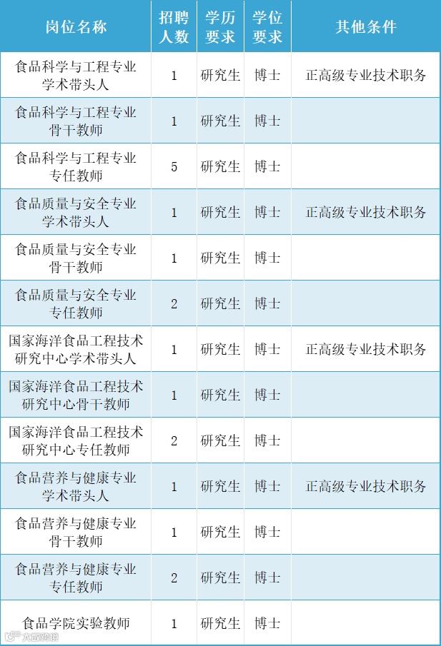 (四)博士专业应为食品科学与工程类、生物学类、化学类、轻工技术与工程类、公共卫生与预防医学类、化学工程与技术类,具备从事食品科学、农畜产品加工及利用、水产品加工及贮藏工程、食品质量与安全、蛋白质资源开发与利用等方向的教学及科研工作的能力,适应岗位要求的身体条件;