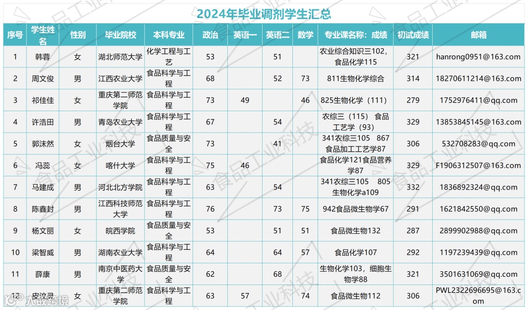 2024年毕业调剂学生汇总@优质考生信息版(4) 食品工业科技编辑部