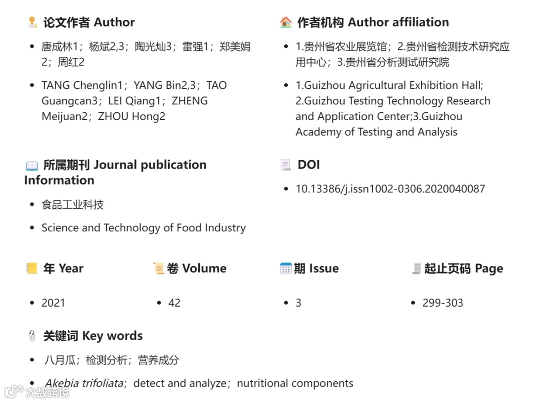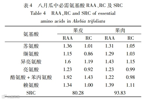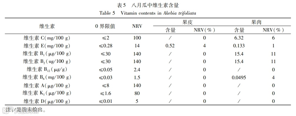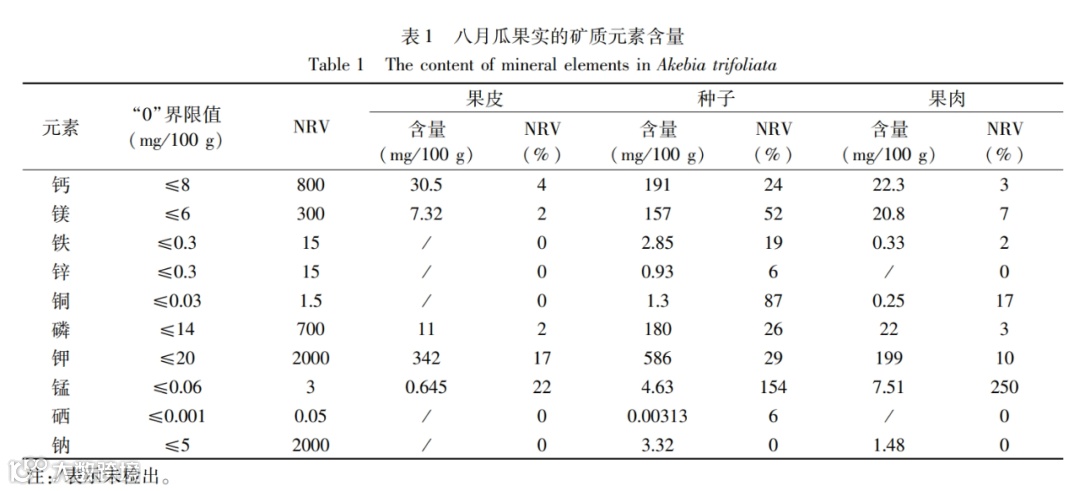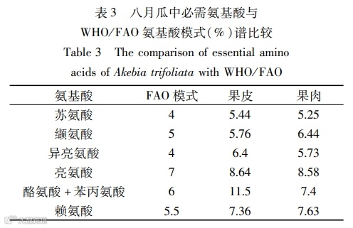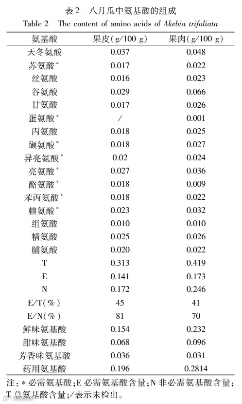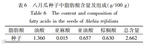矿物元素是人体结构的组成部分并参与人体的生命活动,氨基酸是人体蛋白质的基本组成单位,维生素是人为维持正常的生理功能而必须从食物中获得的一类微量有机物质,脂肪酸可以帮助人体补充人体活动所必要的营养物质。八月瓜矿质元素种类齐全、含量丰富,氨基酸总量丰富,人体必需氨基酸药用氨基酸含量较高,不饱和脂肪酸含量较高。本文通过研究分析,可以得出以下结论: