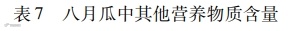 本文用火焰原子吸收光谱法、液相色谱法、荧光分光光度法等实验方法对八月瓜果皮、果肉和种子中营养物质成分进行检测分析。基于检测分析可知,八月瓜果实具有很高的营养价值。其中,八月瓜果皮含有锰、钾矿物质营养成分,含量分别为0.645、0.342 mg/100 g;八月瓜果皮总氨基酸含量为0.313 g/100 g,含15种氨基酸,其中必需氨基酸7种,必需氨基酸比重达到WHO/FAO提出理想蛋白质条件,必需氨基酸含量不及果肉均衡,营养价值比果肉低;含有少量的维生素E、果胶、蛋白质和脂肪。八月瓜种子含有多种矿物质营养成分,即含钾、磷、钙、铁矿物质营养成分,含量分别为586、180、191、2.85 mg/100g;八月瓜种子富含多种矿物质营养成分,即富含锰、铜、镁矿物质营养成分,含量分别为:4.63、1.3、157 mg/100g;脂肪酸含量为2.662 g/100g,不饱和酸含量比重为76%。八月瓜果肉含有铜矿质营养成分,含量为0.25 mg/100 g;富含锰矿物质营养成分,含量为7.51 mg/100g;八月瓜果肉总氨基酸量含量为0.419 g/100 g,含16种氨基酸,其中必需氨基酸8种,必需氨基酸比重达到WHO/FAO提出理想蛋白质条件,必需氨基酸含量均衡,营养价值高;含有少量的维生素、脂肪、蛋白质和黄酮。