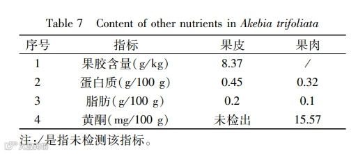 In order to analyze and evaluate the nutritional value of Akebia trifoliata fruit, Flame Atomic Absorption, Spectrometry, Liquid Chromatography, Fluorescence Spectrophotometry and other experimental methods was used to detect and analyze the nutritional components in the peel, pulp and seed of Akebia trifoliata. Based on the detection and analysis, it could be seen that Akebia trifoliata fruit had high nutritional value. Among them: The peel of Akebia trifoliata contains mineral nutrients of Mn and K,the contents of Mn and K were 0.645 and 342 mg/100 g respectively. The total amino acid content in the peel of Akebia trifoliata was 0.313 g/100 g, containing 15 kinds of amino acids, including 7 kinds of essential amino acids. The proportion of essential amino acids reached the ideal protein conditions proposed by WHO / FAO. The content of essential amino acids was less than that of pulp, and the nutritional value was lower than that of pulp. It contained a small amount of vitamin E, pectin, protein and fat. The seed of Akebia trifoliate contained many mineral nutrients, including K,P, Ca and Fe, with the contents of 586, 180, 191 and 2.85 mg/100 g, respectively. The seed of Akebia trifoliata was rich in many mineral nutrients, including Mn, Cu and Mg, with the contents of 4.63, 1.3 and 157 mg/100 g, respectively. The fatty acid content was 2.662 g/100 g, and the proportion of unsaturated acid was 76% .The pulp of Ahebia trifoliate contains Cu mineral nutrients and the content was 0.25 mg/100 g, was rich in Mn mineral nutrients and the content was 7.51 mg/100 g. The total amino acid content of Akxebia trifoliata was 0.419 g/100 g, containing 16 kinds of amino acids, including 8 kinds of essential amino acids. The proportion of essential amino acids reached the ideal protein conditions proposed by WHO / FAO, the content of essential amino acids was balanced and the nutritional value was high small amounts of vitamins, fats, proteins and flavonoids.