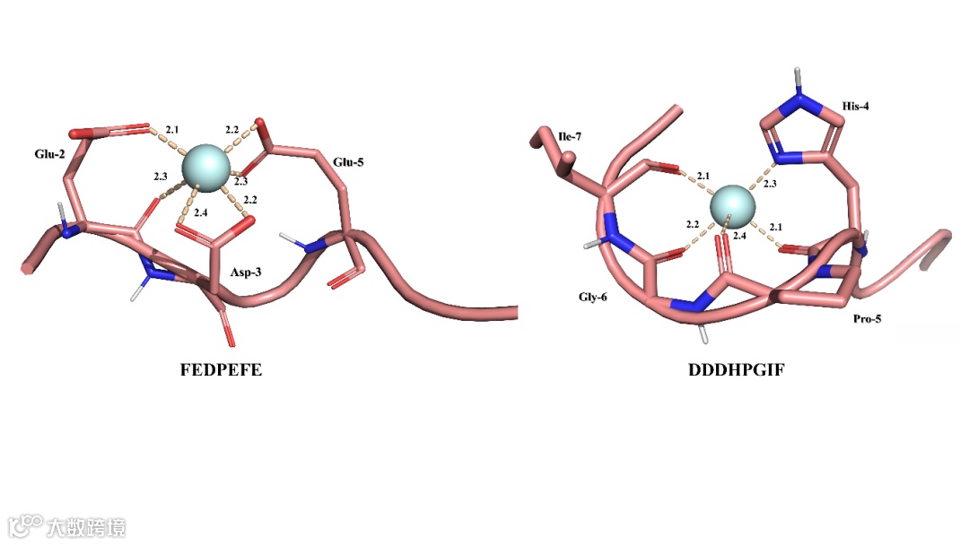 图4. 七肽(FEDPEFE)-亚铁和八肽(DDDHPGIF)-亚铁的分子对接构象图