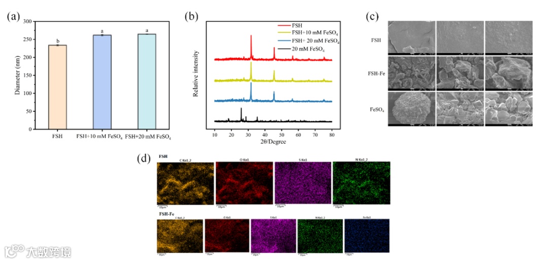 图2. 发酵扇贝裙边水解物及其亚铁螯合物的粒径(a)、XRD(b)、扫描电镜(c)和元素分析图(d)