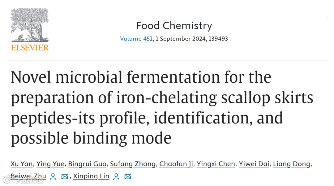 ●2024年4月29日,大连工业大学朱蓓薇院士团队在中科院1区学术期刊《Food Chemistry》(Q1, IF: 8.8)在线发表题了为“Novel microbial fermentation for the preparation of iron-chelating scallop skirts peptides-its profile, identification, and possible binding mode”的研究性论文。大连工业大学食品学院、海洋食品加工与安全控制全国重点实验室、国家海洋食品工程技术研究中心朱蓓薇院士和林心萍教授为共同通讯作者,21级博士研究生颜旭为第一作者。该研究得到了辽宁省教育厅高校基本科研项目(JYTMS20230426)的资助。