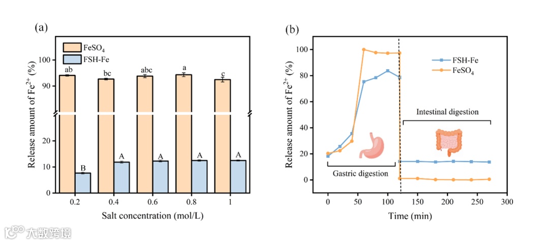 图3. 发酵扇贝裙边水解物及其亚铁螯合物在盐溶液(a)和体外模拟胃肠道中(b)的稳定性分析