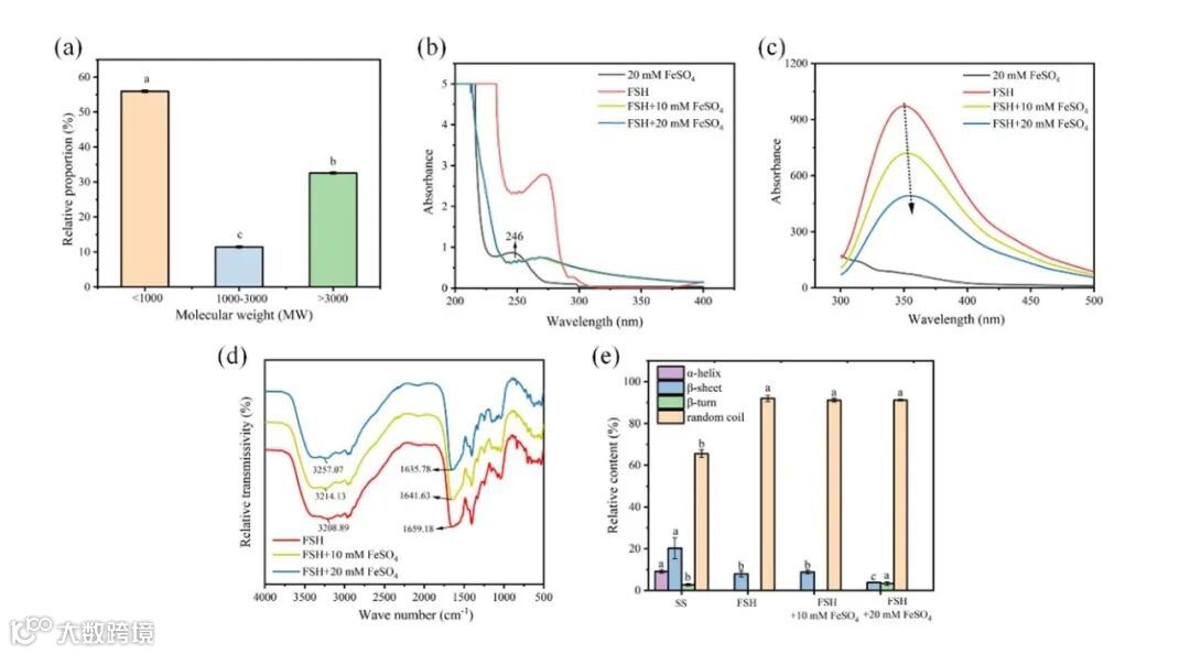 图1. 发酵扇贝裙边水解物及其亚铁螯合物的分子量分布(a)、紫外光谱(b)、荧光光谱(c)、红外光谱(d)和圆二色谱图(e)