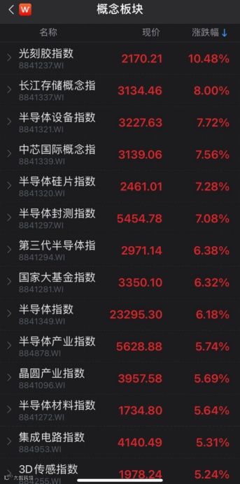 截至午间收盘,Wind概念板块涨幅榜上几乎满屏的科技类板块。其中,光刻胶概念板块半日大涨10.48%,长江存储概念板块涨8.00%,半导体设备、中芯国际、半导体硅片、半导体封测概念板块均涨逾7%。