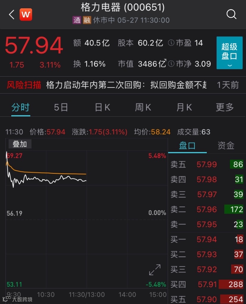 另外,昨日抛出百亿元级别回购计划的格力电器今日早盘则高开低走。截至午间收盘,格力电器涨3.11%,报57.94元,最新总市值为3486亿元。