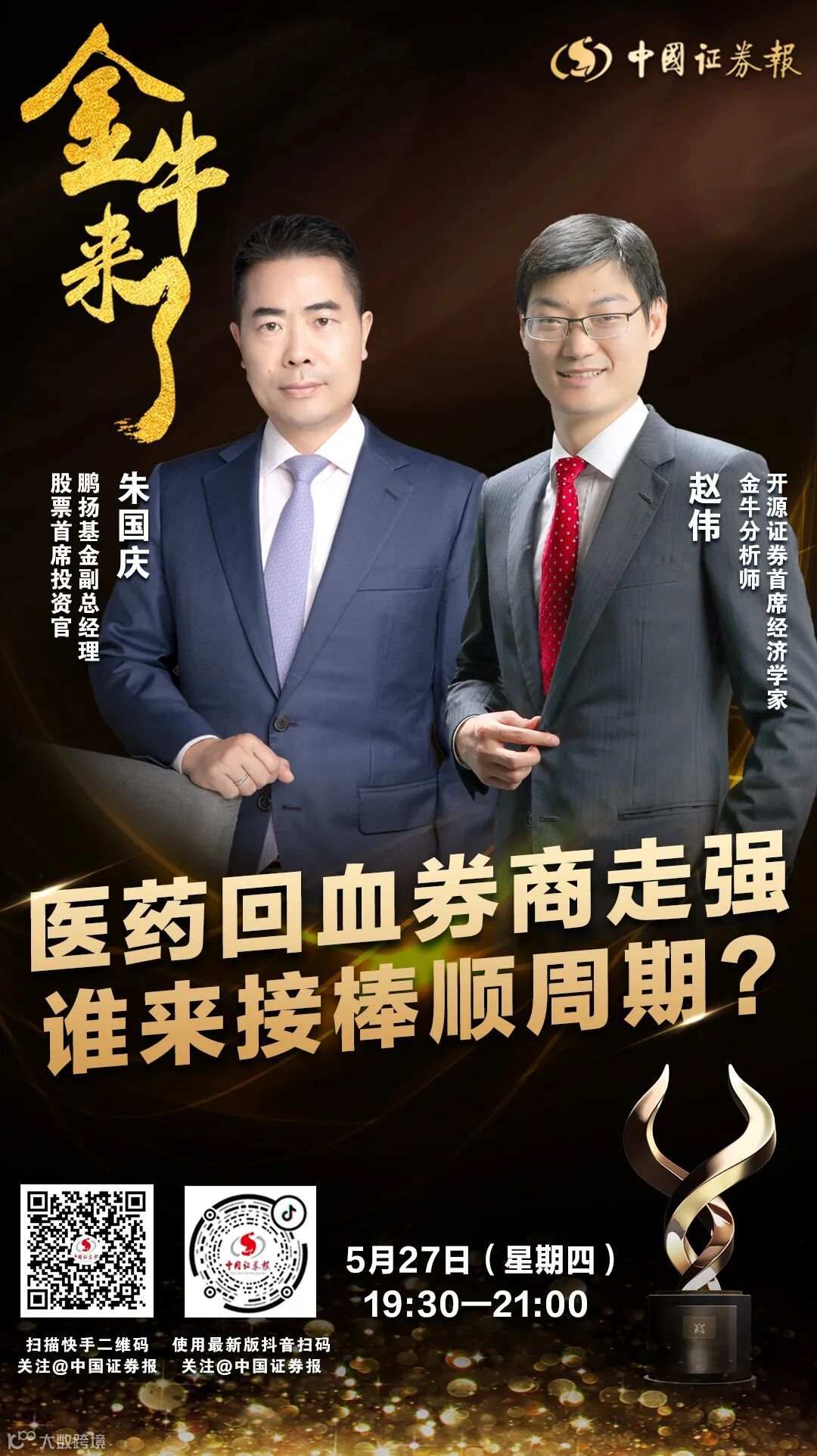 5月27日(周四)晚7点半,鹏扬基金副总经理、股票首席投资官朱国庆,以及金牛分析师、开源证券首席经济学家赵伟将做客中证报“金牛来了”,围绕“医药回血券商走强,谁来接棒顺周期?”为你在线答疑解惑。