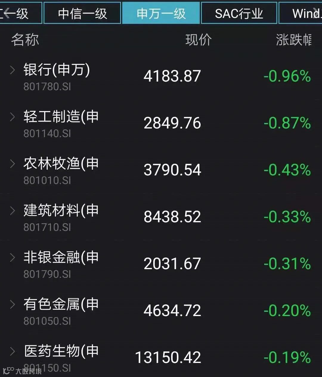截至午间收盘,据Wind数据,申万一级行业中银行、农林牧渔板块位居跌幅前列,分别跌0.96%、0.43%;银行板块内仅有7只成分股上涨。