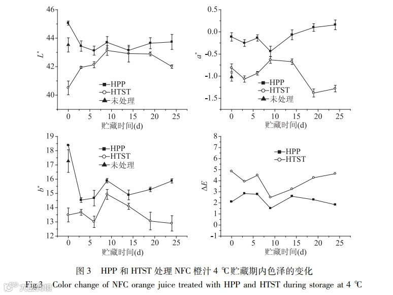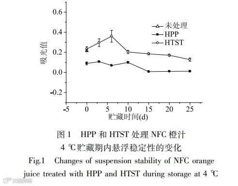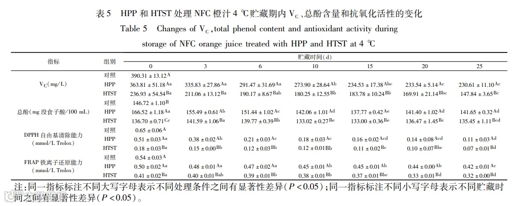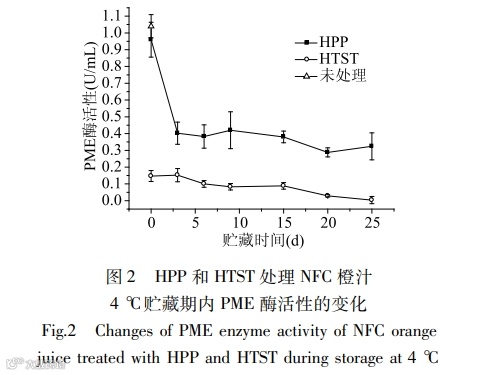 Orange juice is one of the most consumed juice in the world. However, it is mainly sterilized by conventional heat treatment, which will cause some of the heat-sensitive flavor and nutrients lost. High pressure processing (HPP) is a novel non-thermal processing technology, which could achieve effective pasteurization and regulation of enzyme activity at room temperature, and maintain the fresh quality of the food. In this study, the effects of HPP (600 MPa, 1 min) and high temperature short time (HTST, 110 ℃, 8.6 s) on microorganisms, basic physical and chemical indicators, color, stability, biologically active ingredients, antioxidant activity and other qualities of not from concentrate (NFC) orange juice were analyzed before and after treatment, and during 25 days of storage at 4 ℃. The results showed that after HPP and HTST treatment, the total number of total plate count, yeast & molds, lactic acid bacteria, and psychrotrophic bacteria of orange juice decreased below the detection limit (<10 CFU/mL). After 25 days of storage. All the microorganisms of HPP-treated orange juice were still not detected, while the total plate count and yeast & molds of HTST-treated orange juice began to grow. The total color difference (ΔE) of HPP-treated juice was lower than that of HTST-treated juice, and the color difference between HPP and untreated juice was small. Compared with the control, HPP treatment significantly increased the total phenol contents of orange juice by 13.50% (P<0.05), but showed no significant effect on vitamin C content, DPPH scavenging ability, FRAP iron ion reduction ability, and comprehensive sensory evaluation, while these indexes were significantly decreased after HTST treatment (P<0.05). After HPP and HTST treatment, the residual enzyme activities of pectin methylesterase (PME ) in orange juice were 92.31% and 14.42%, respectively, and at the end of storage, there were 30.77% and 0.03% residue activity still left, respectively. Because of the residual enzyme activity of PME, the suspension stability of HPP orange juice decreased by 95.45% during storage. In summary, HPP maintain the nutrition, sensory quality and fresh flavor of orange juice better than HTST treatment, however the inactivation of PME should be improved. The study provides a reference for the application of HPP in NFC orange juice.