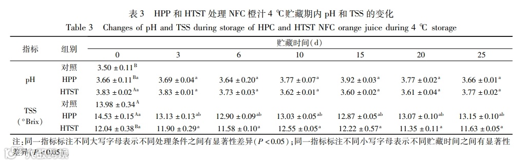 实验结果表明相比HTST 处理(110 ℃ 8.6 s)HPP 处理( 600 MPa,1 min)对 NFC 橙汁杀菌效果较好,4 ℃贮藏 25 d 后微生物均未检出( < 10 CFU/mL).对 pH 和 TSS 基本理化指标无显著影响,对总酚、维生素 C、抗氧化活性、天然色泽和感官风味有更好的保护作用。但单独的 HPP 处理仍存在难以完全钝化PME 活性的问题,会导致橙汁稳定浑浊的丧失和贮藏期间稳定性的下降,未来可以通过 HPP 结合温度处理来解决。综合来看,HPP 处理橙汁更符合消费者对更营养、更健康产品的需求,是一种可以用于高品质 NFC 橙汁的加工方法。