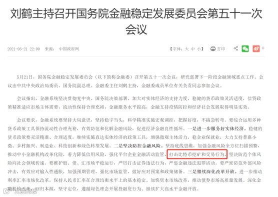 5月21日,国务院金融稳定发展委员会(以下简称金融委)会议明确提出,打击比特币挖矿和交易行为。