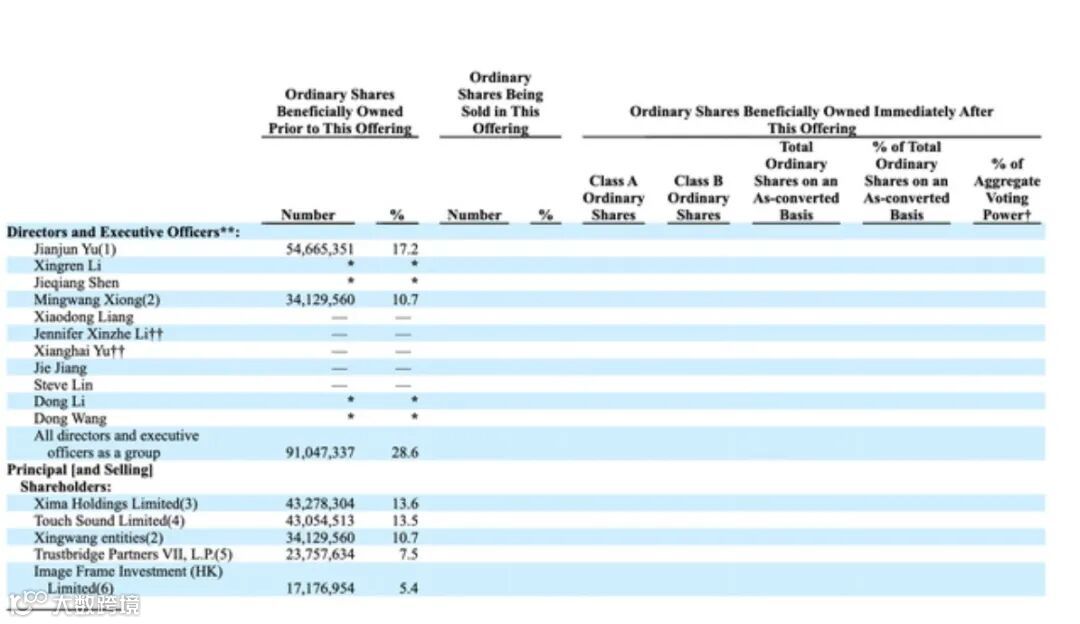 公司股权结构显示,喜马拉雅联合创始人、董事长及首席执行官余建军在IPO前持有5466.54万股普通股,持股比例为17.2%;董事熊明旺持有3412.96万股普通股,持股比例为10.7%。公司所有董事和高管总共持有9104.73万股普通股,总持股比例为28.6%。