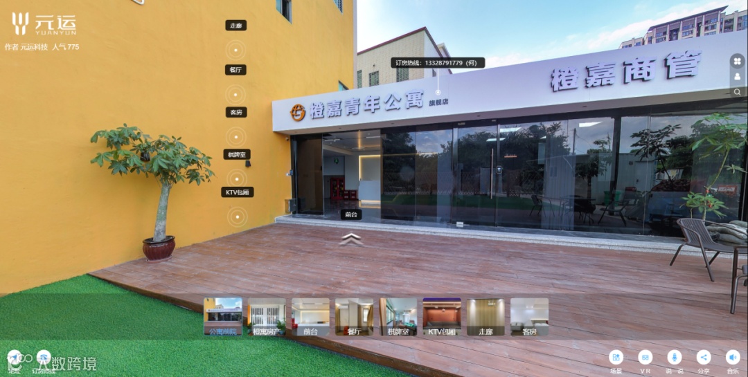 同时元运科技智慧酒店VR全景宣传方案,还提供招租广告、互动留言、线上预定等互动功能,引导客户一键下单,大大提高酒店成交率!
