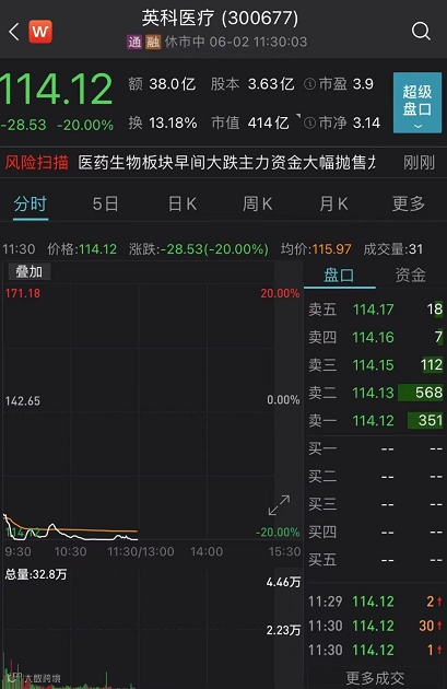 “手套茅”英科医疗今日上午放量跌停,截至中午收盘报114.12元,成交38亿元。