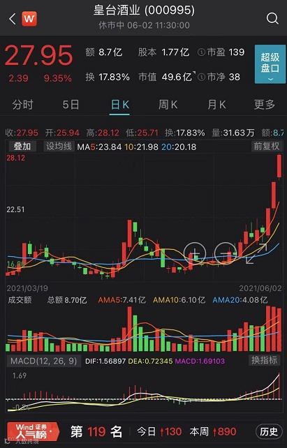 今日上午,白酒板块逆势再度上涨,有着“西北茅台”之称的皇台酒业盘中一度涨停,实现三连板,截至中午收盘上涨9.35%。
