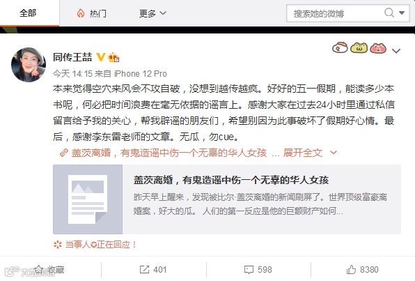随后王喆曾经的同事、口译教师李东雷也在其微信号“东雷老评”中发文章《盖茨离婚,有鬼造谣中伤一个无辜的华人女孩》,直接帮助王喆澄清。