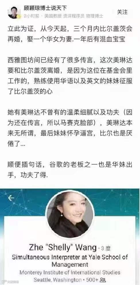 立帖为证?社媒号称盖茨3个月再婚华人女翻译