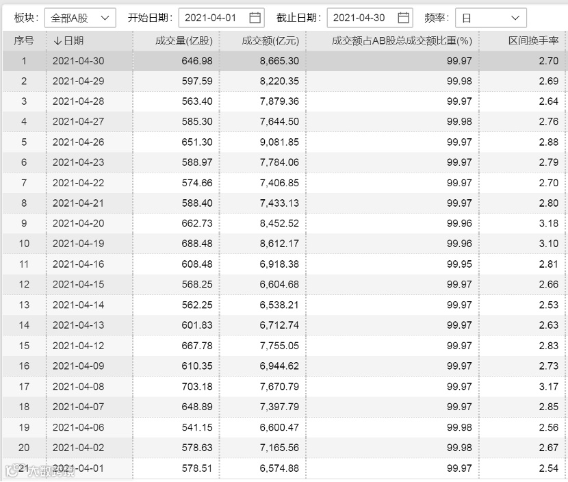 从成交额情况来看,Wind数据显示,4月A股的成交额维持在相对低位,4月的21个交易日中,成交额最大的交易日为4月26日,成交额为9081.85亿元,而成交额最低的交易日为4月14日,成交额为6538.21亿元。