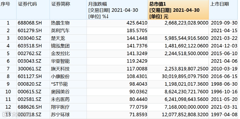 随着4月A股收官,4月十大牛股新鲜出炉,在当月涨幅前12只个股中,仅有英利汽车、华亚智能两只月内上市的新股。剔除月内上市新股和4月14日才开板的新股楚天龙后,4月十大牛股为热景生物、锦泓集团、金发拉比、旗天科技、小康股份、*ST节能、奥园美谷、未名医药、翔宇医疗、苏宁环球。