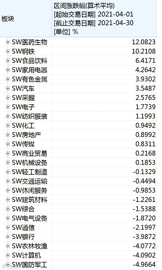 从行业板块来看,Wind数据显示,算术平均涨跌幅来看,4月申万一级28个行业涨跌参半,涨幅最大的医药生物行业累计上涨12.09%,涨幅次之的钢铁行业累计上涨10.21%。跌幅最大的公用事业行业下跌9.84%,跌幅第二大的非银金融行业下跌5.19%。