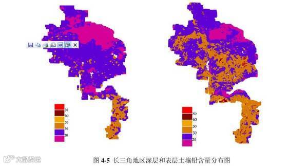 这张图解释一下,地图是长三角核心的 16 个城市,表示的是铅的浓度分布,左图为土壤深层,而右图为土壤浅层。