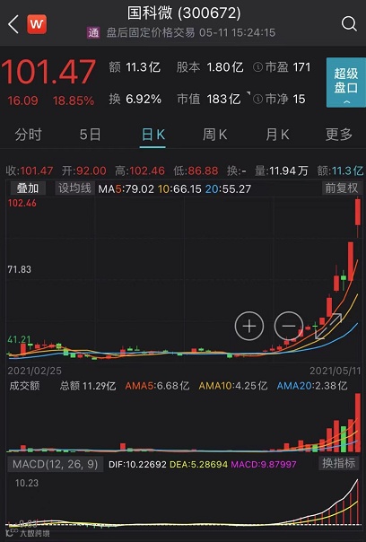 5月11日,国科微上涨18.85%,报101.47元,创出历史新高,仅仅9个交易日,该股股价已翻倍。