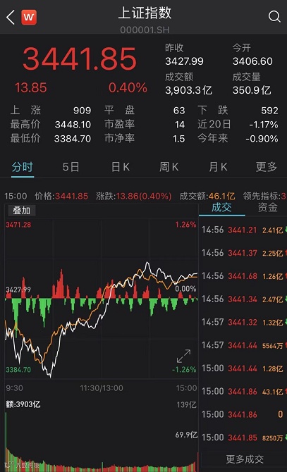 5月11日,A股三大股指集体低开,上证指数早盘逐级下探,一度跌超1.2%,随后探底回升。全天收盘,上证指数上涨0.4%,收报3441.85点;深证成指上涨0.35%,收报13966.79点;创业板指下跌0.01%,收报2921.34点。
