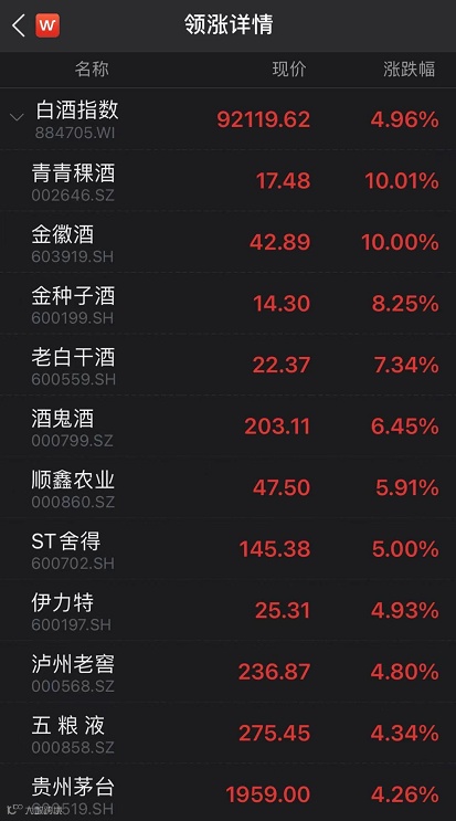 今日Wind白酒指数大涨4.96%,青青稞酒、金徽酒、ST舍得涨停。
