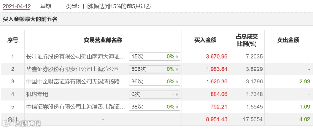 中电环保则是“一日游”。4月12日,长江证券佛山南海大道证券营业部、华鑫证券上海分公司席位、中金财富无锡清扬路证券营业部分别买入3671万元、1984万元和1620万元。4月13日,这3个席位大举出货,分别卖出4062万元、2131万元和1757万元。