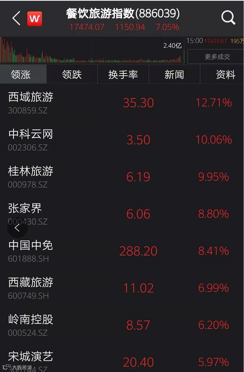 餐饮旅游板块强势领涨。截至收盘,西域旅游涨12.71%,桂林旅游、中科云网涨停,张家界、中国中免涨超8%,宋城演艺涨近6%。