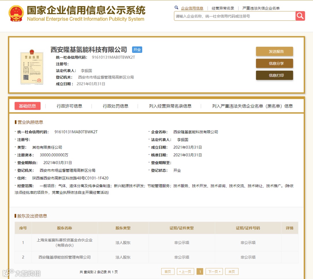 除隆基外,此次西安隆基氢能科技有限公司的另一位股东则是号称“金手指”的朱雀投资旗下企业。