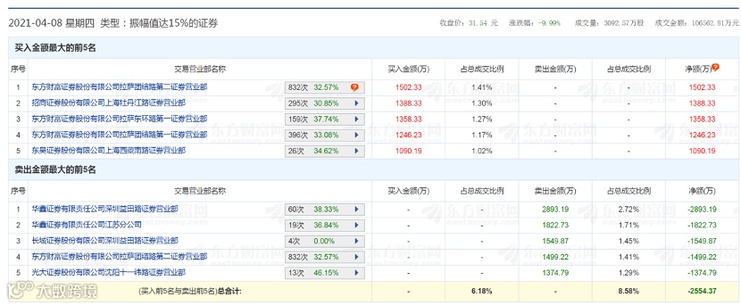 一位市场人士表示,今日出现在“妖股”卖出席位中的多为游资。出现在买入席位中的东方财富证券拉萨的几个营业部堪称“散户大本营”。
