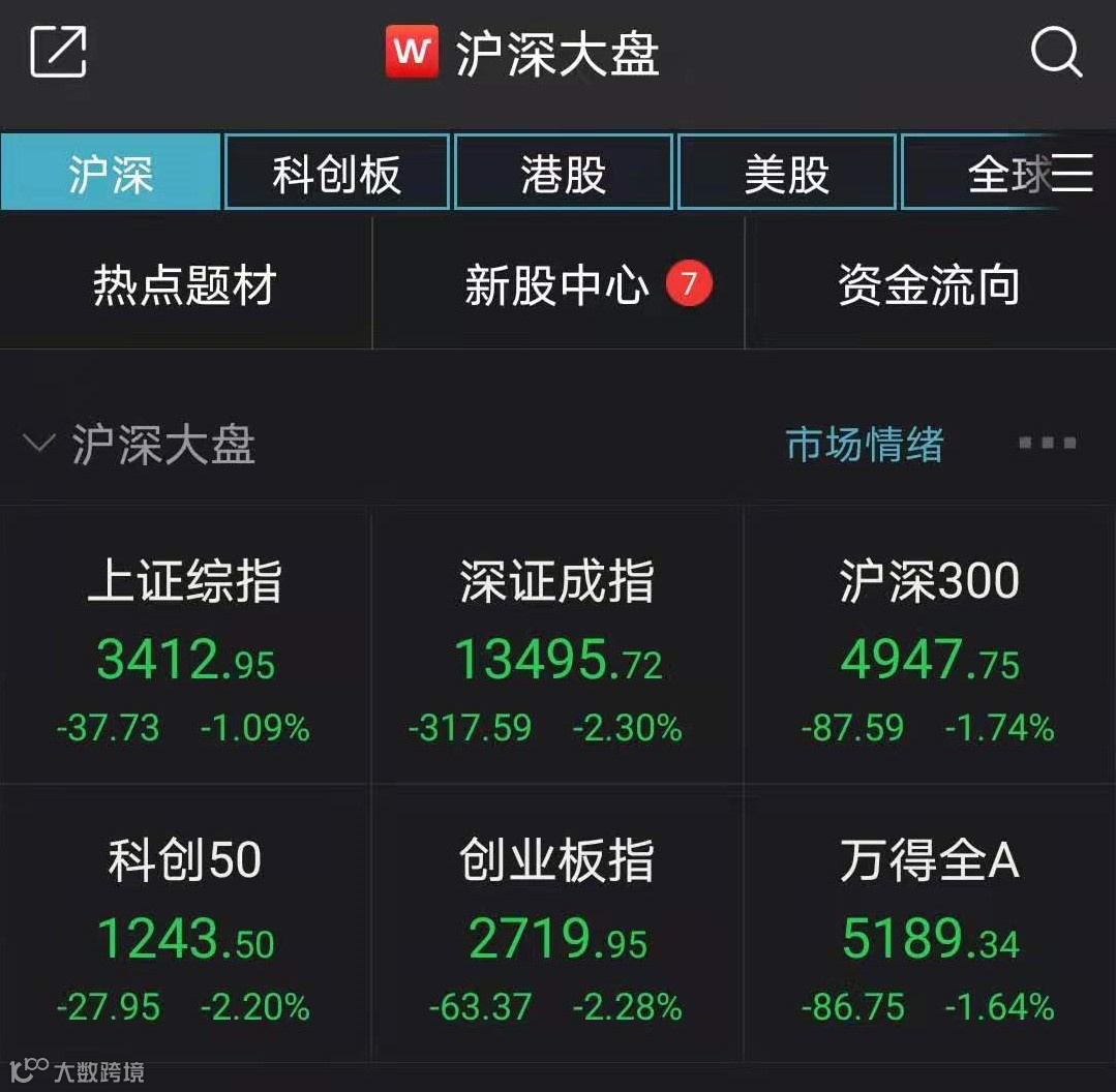 4月12日,A股延续上周五回调趋势,全天呈现近乎单边下行走势。Wind数据显示,截至收盘,上证指数跌1.09%,报3412.95点;深证成指跌2.30%,报13495.72点;创业板指跌2.28%,报2719.95点。两市成交超过7700亿元,超过3000只个股收跌。