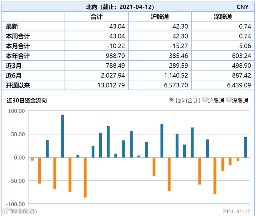 北向资金今日也逆势抄底。Wind数据显示,截至收盘,北向资金今日净买入43.04亿元,结束了连续4个交易日净流出的态势,其中沪股通资金净买入42.30亿元,深股通资金净买入0.74亿元。今年以来,北向资金净买入规模合计988.70亿元。