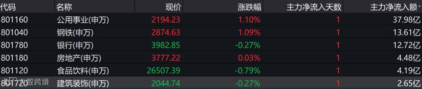 尽管市场赚钱效应低迷,但仍有板块获得大手笔加仓。Wind数据显示,今日共有9个申万一级行业获主力资金买入,其中公用事业板块单日获主力资金大幅净流入37.98亿元,规模遥遥领先。主力资金买入较多的还有钢铁和银行板块,其净流入规模分别为13.61亿元、12.72亿元。