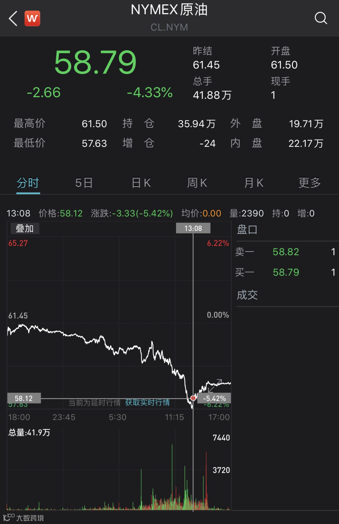 当日盘中,纽约原油期价最低跌至每桶57.63美元(跌幅达6.2%),日内接连跌破61、60、59和58美元四道关口,跌至3月25日以来低点。布伦特原油期价最低跌至每桶61.25美元(跌幅达5.6%),日内接连跌破64、63和62美元三道关口,也刷新3月25日以来低位。