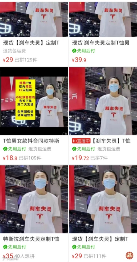 事件不断发酵,有不少服装商家发现“商机”,连夜赶工生产,火速上架了“刹车失灵”同款T恤,将女子维权的照片放置在商品主页,已有不少成交量。这是“活广告”要满街走的节奏?