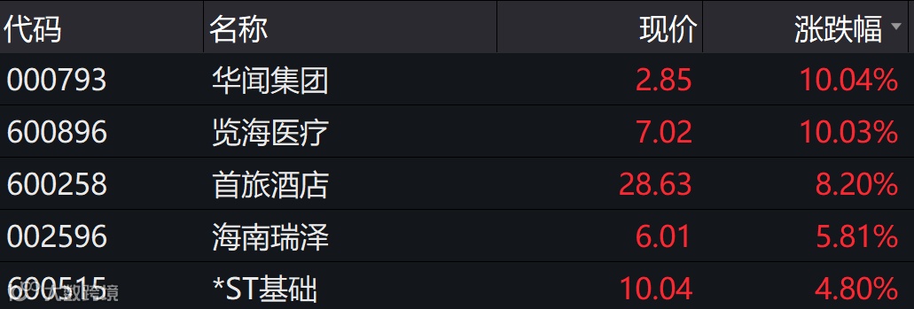 Wind数据显示,海南相关概念股华闻集团、览海医疗涨停,首旅酒店、海南瑞泽涨幅分别为8.20%、5.81%。